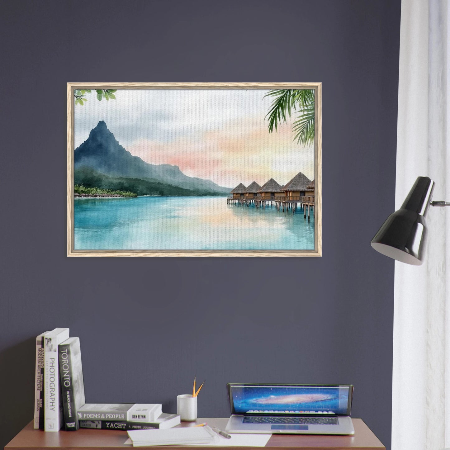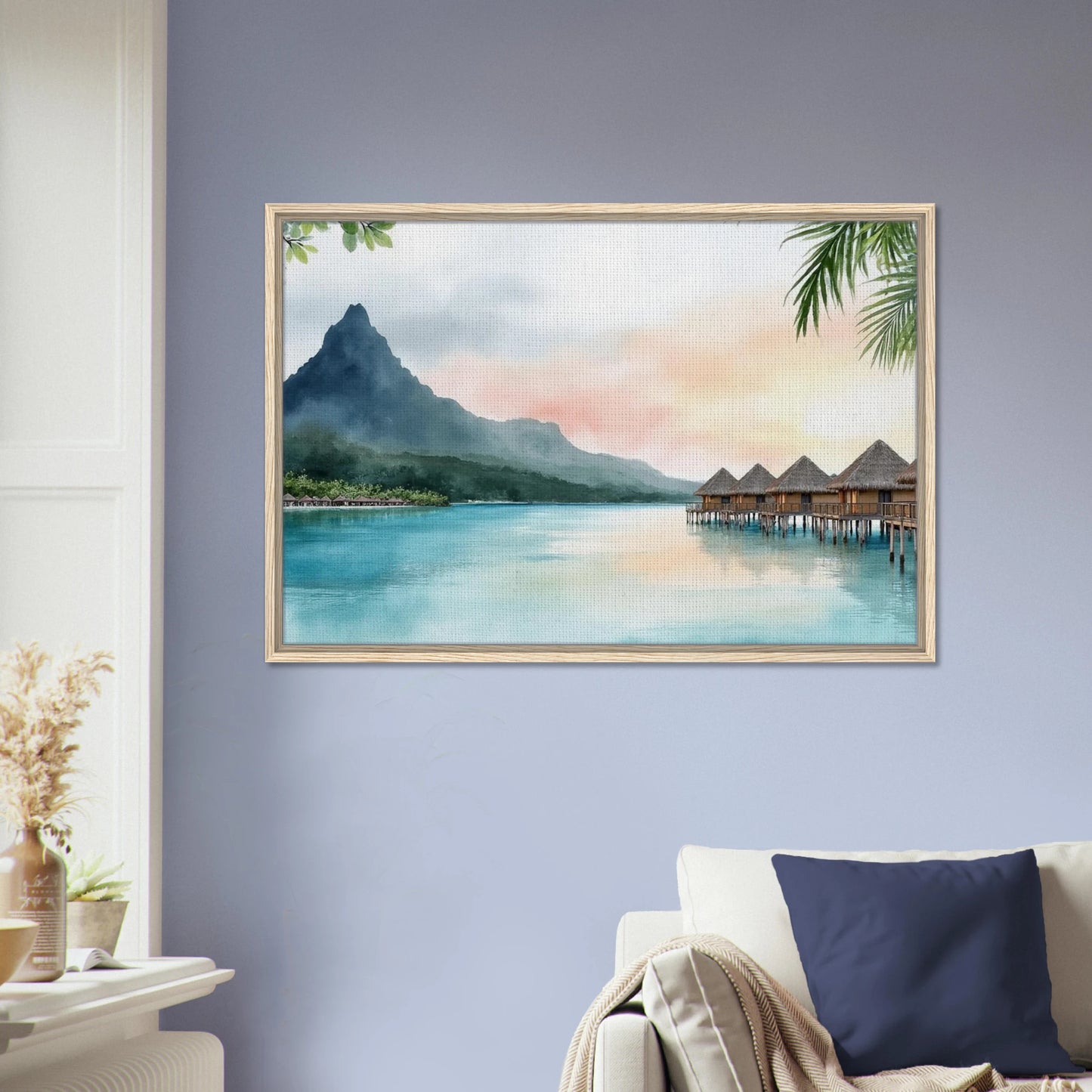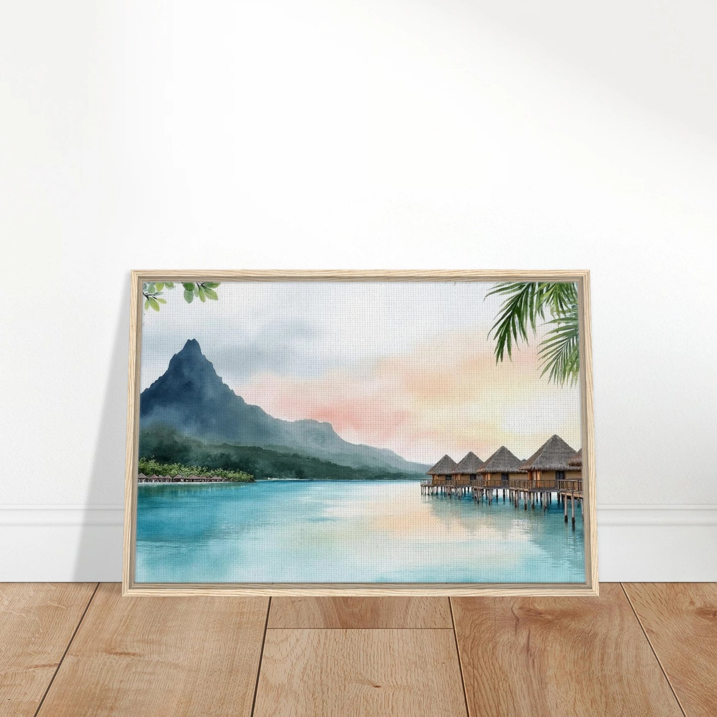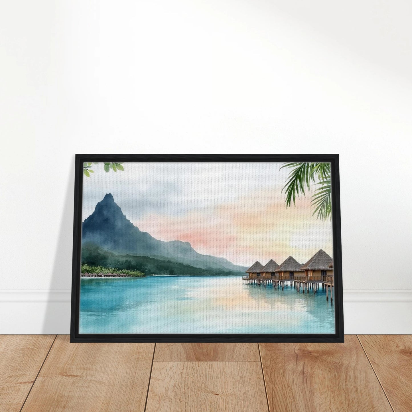 A serene watercolor painting capturing the iconic overwater bungalows of Bora Bora at sunset. Tranquil turquoise waters reflect the pastel sky, while Mount Otemanu rises majestically in the background. Lush tropical foliage frames the dreamy island scene, creating a perfect escape into paradise