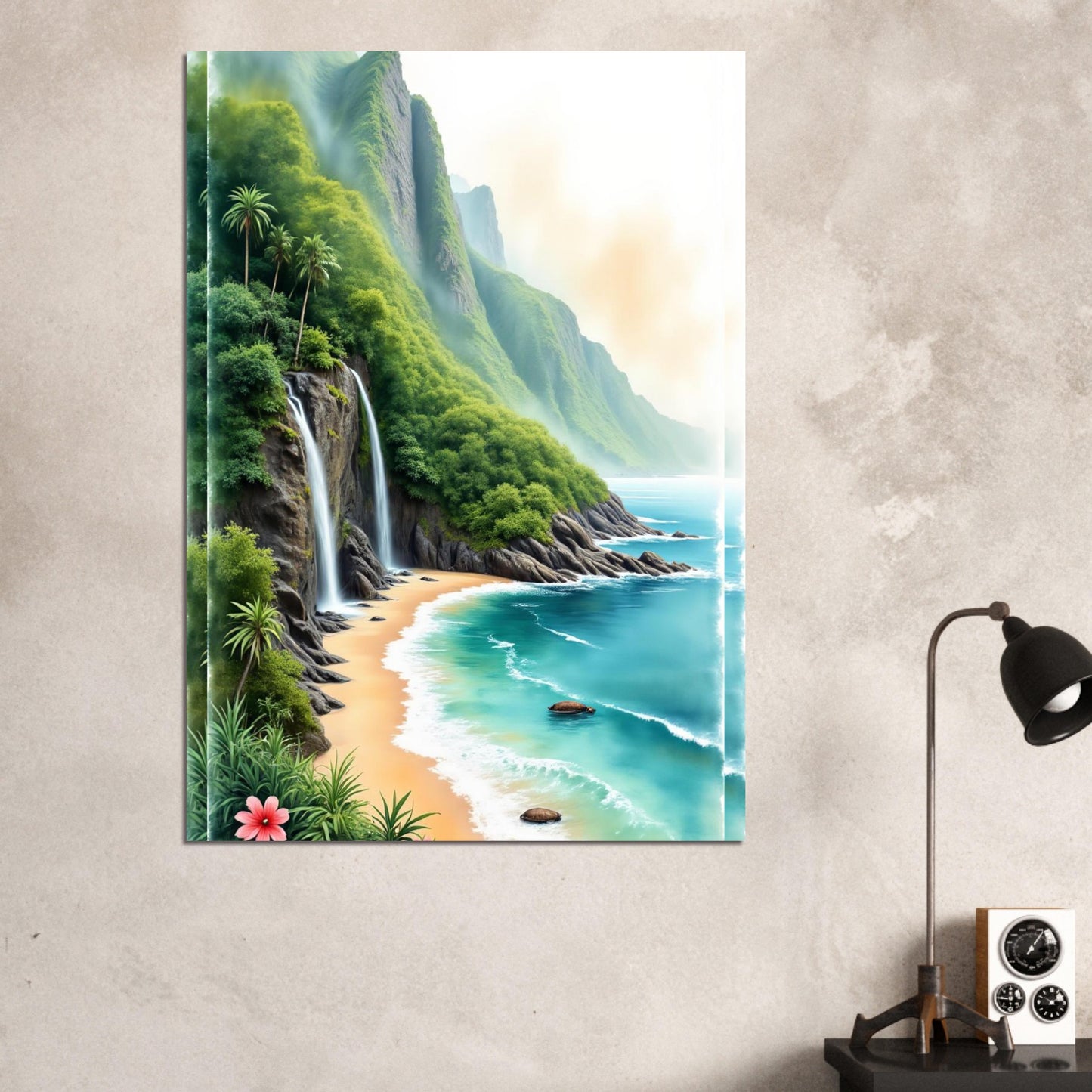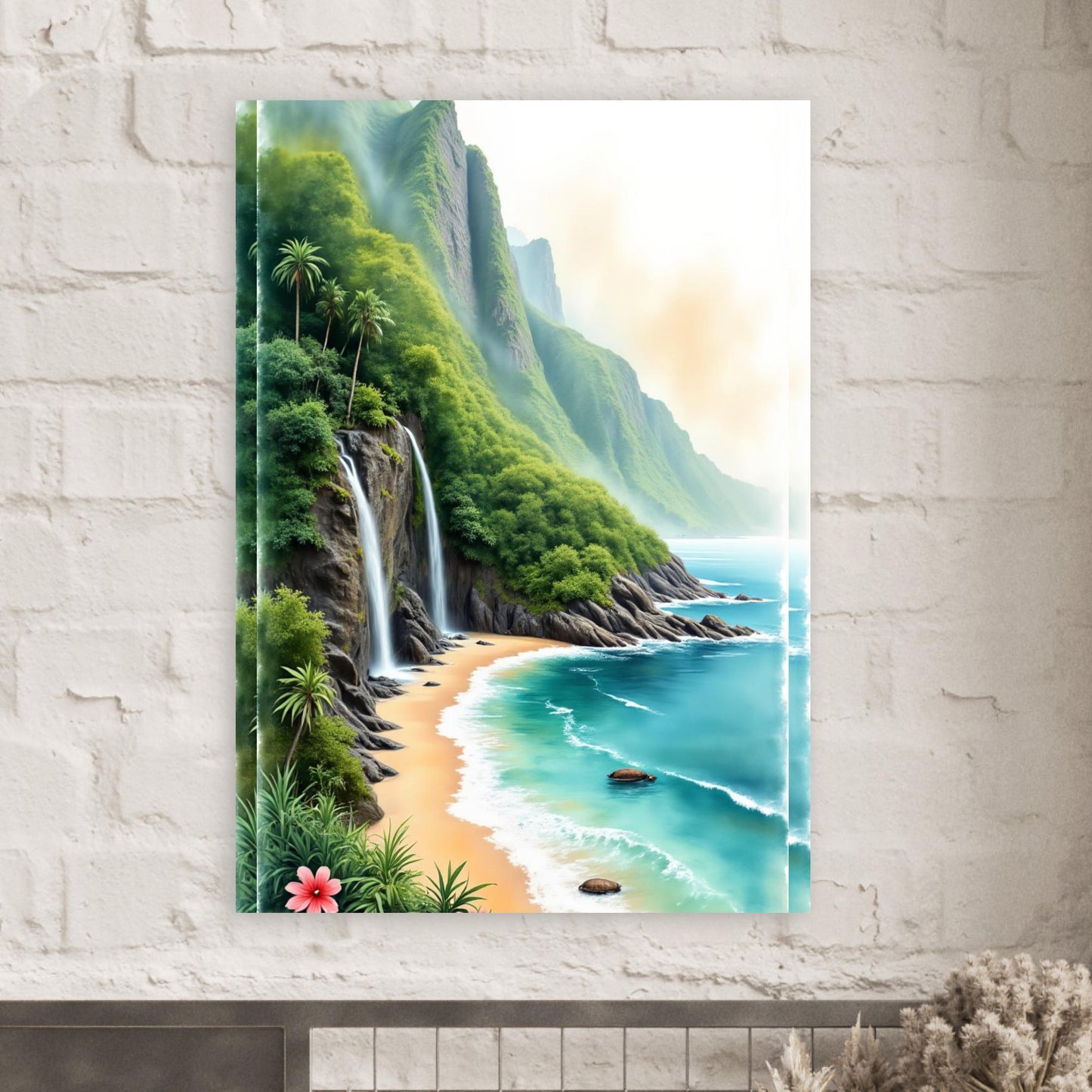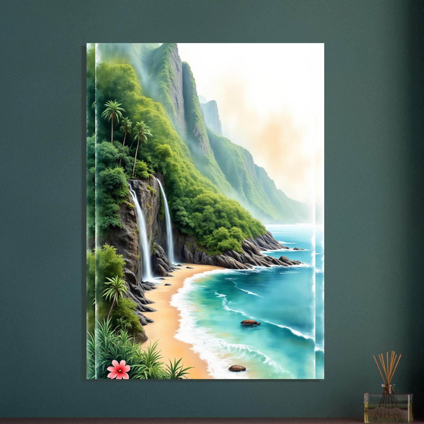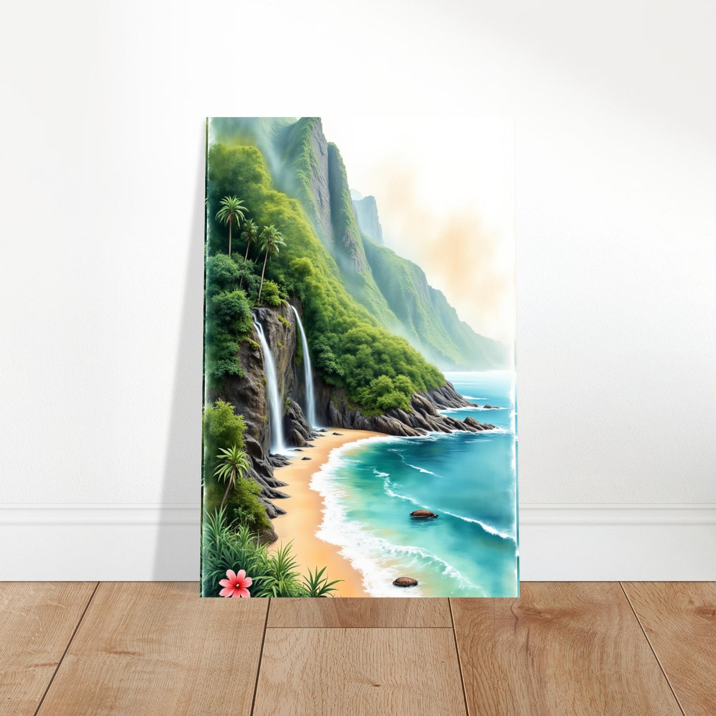 A stunning watercolor landscape featuring a dramatic coastal scene with cascading waterfalls tumbling down lush green cliffs. Crystal turquoise waters meet a pristine sandy beach, while tropical palm trees and vibrant hibiscus flowers add exotic charm. The misty mountains create a dreamlike atmosphere in this paradise setting.
