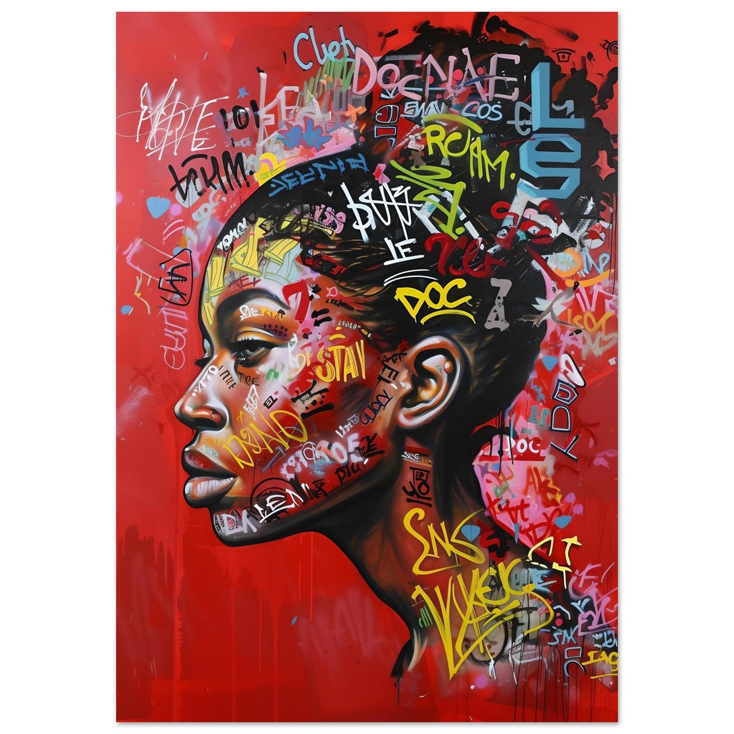 Dynamic street art-inspired design featuring a vibrant profile portrait against a bold red background. Colorful graffiti elements and typography create an energetic urban atmosphere. Modern street culture aesthetic with a striking color palette of reds, blacks, blues, and yellows in a contemporary art style