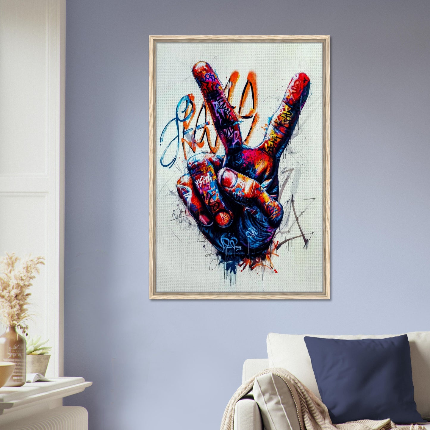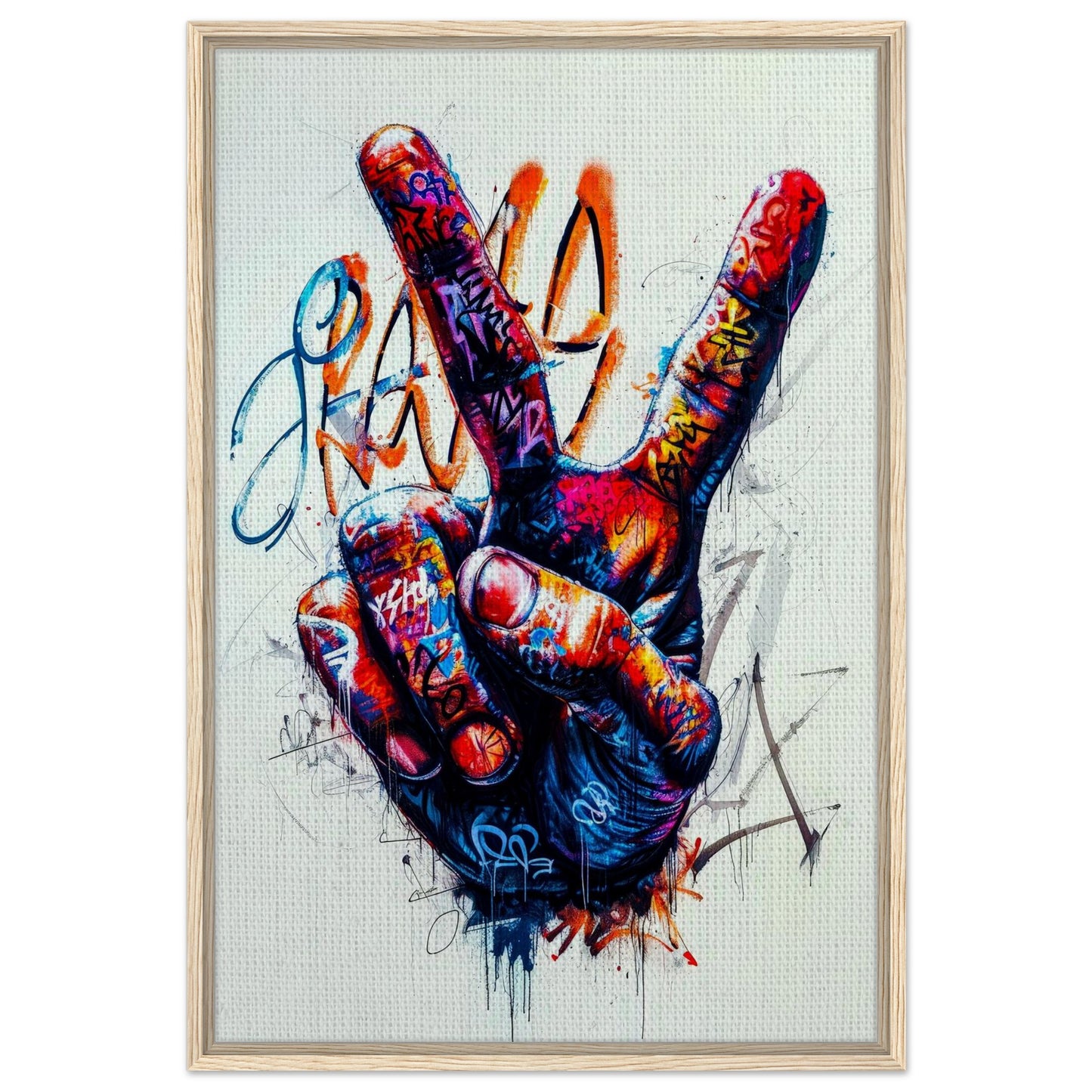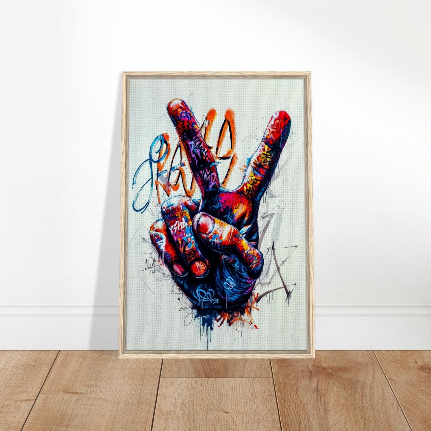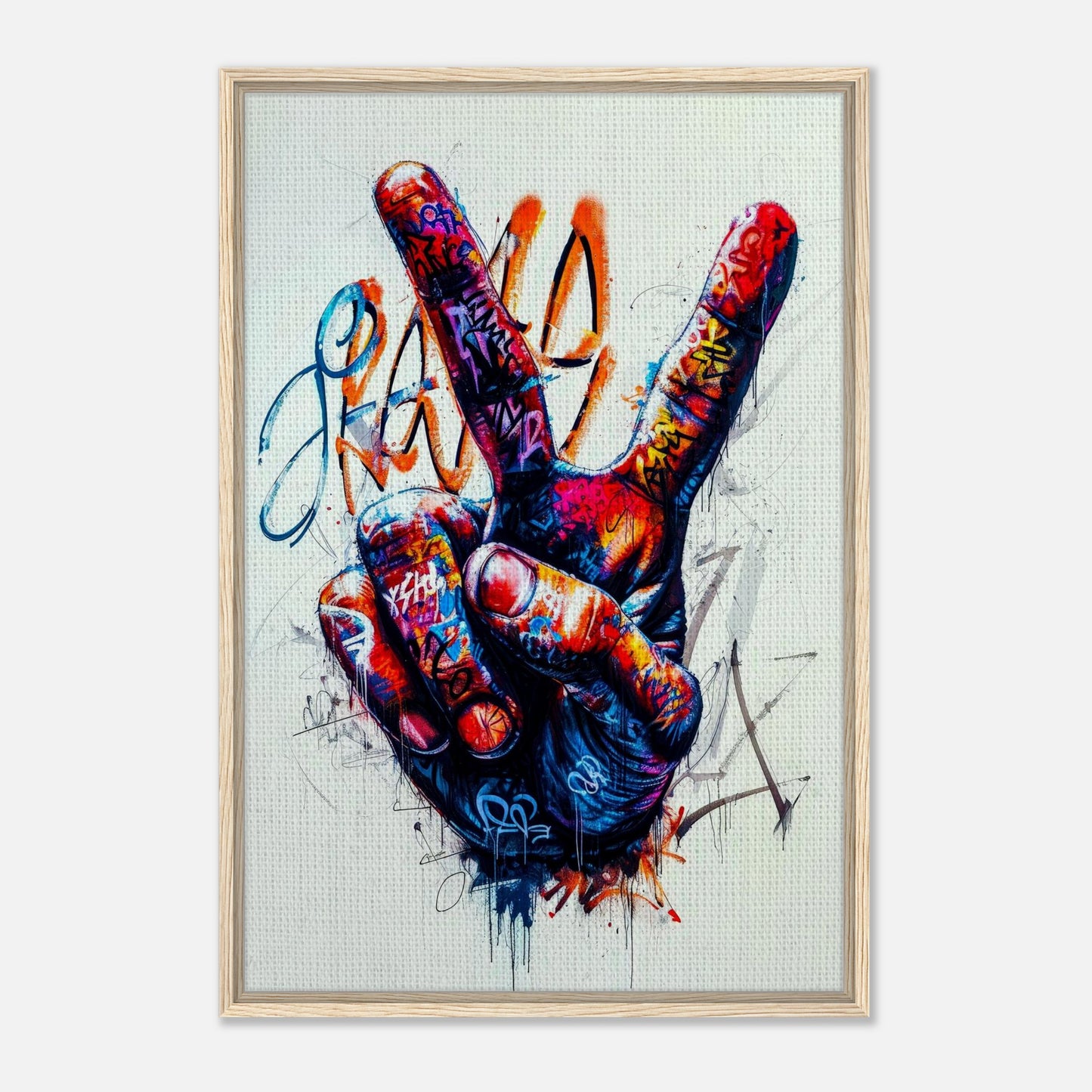Vibrant street art featuring a hand making the peace sign, covered in dynamic graffiti tags and splashes. Bold colors of red, blue, and orange create an energetic urban aesthetic with a rebellious spirit. The artwork combines street culture with a message of peace through expressive drips and abstract elements