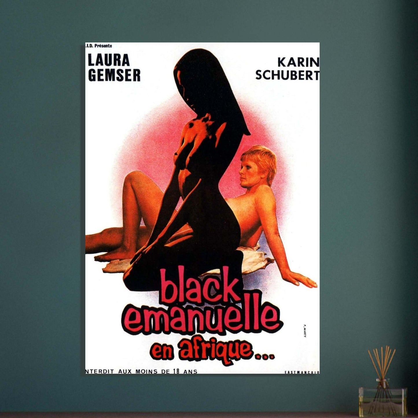 A striking vintage film poster design featuring bold red and black color contrasts against a white background. The artistic composition creates a dramatic silhouette effect with provocative styling typical of 1970s exploitation cinema. The typography presents a distinctive retro aesthetic with bold red lettering