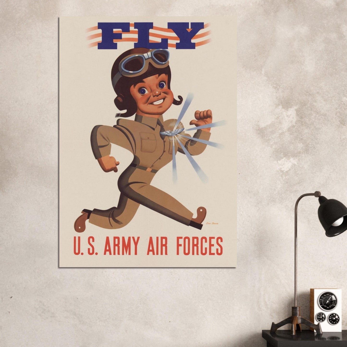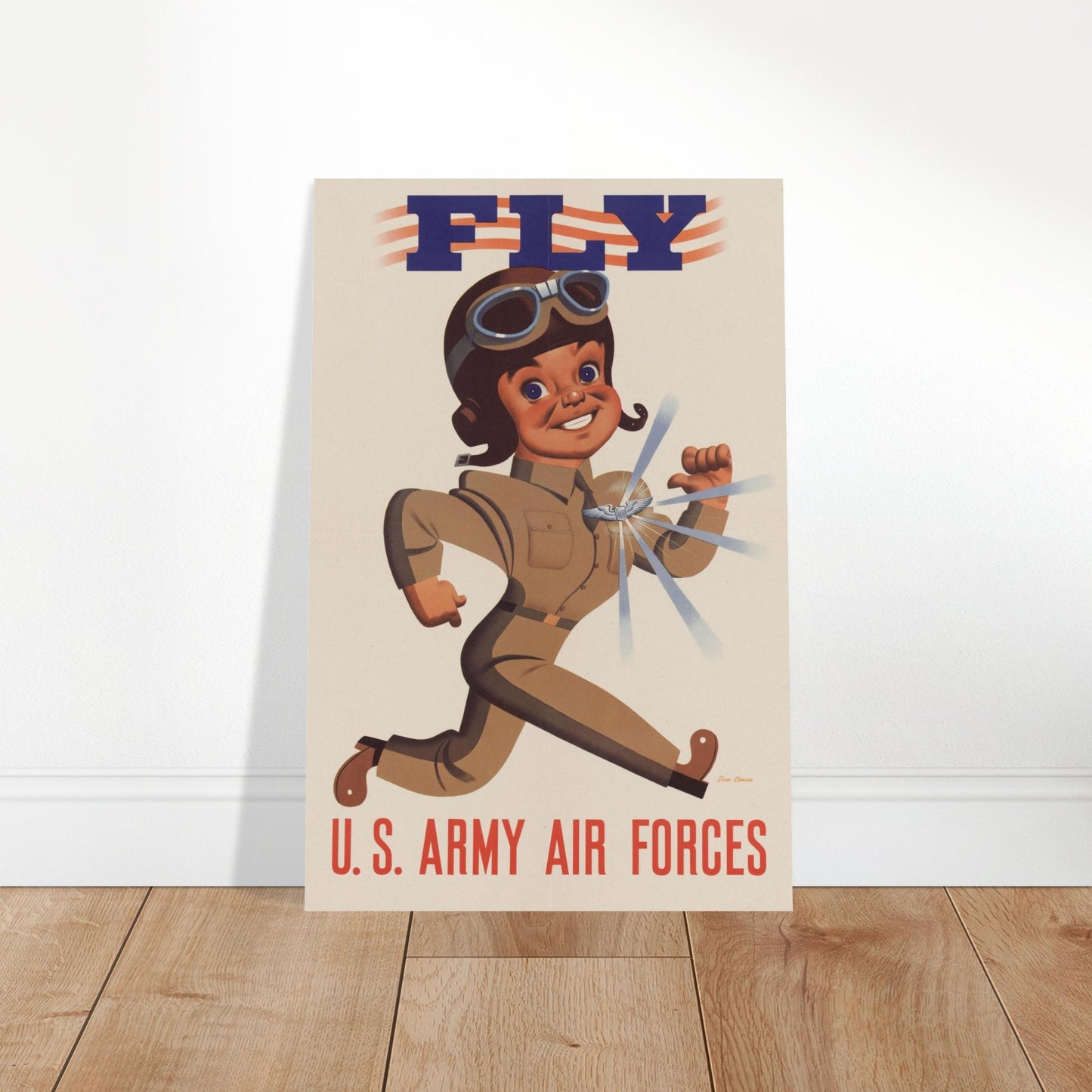A charming retro-style illustration featuring an animated aviator character in a tan flight suit and goggles against a cream background. The bold text 'FLY' appears with patriotic red and white stripes, while 'U.S. ARMY AIR FORCES' anchors the bottom in red. The artwork captures the optimistic spirit of vintage military recruitment posters with its distinctive mid-century design aesthetic