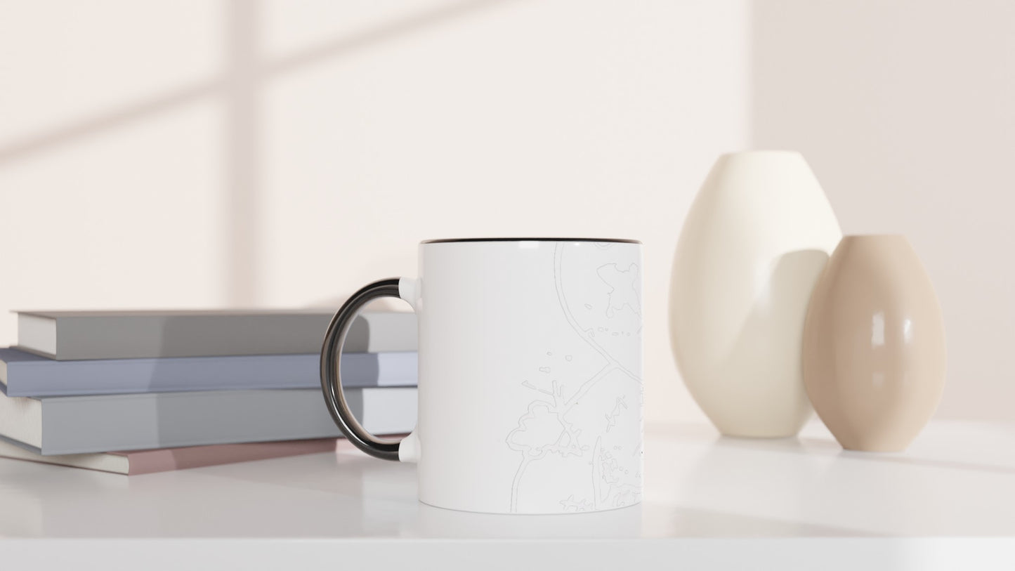 This beautiful ceramic mug is perfect for any event of the day. Your morning coffee, a hot chocolate, or any other hot beverage you enjoy. The mug is glossy white with a colored rim, inside, and handle. The prints come out beautifully and vividly on it. The print retains its quality and luster when used in both microwaves and the dishwasher.
