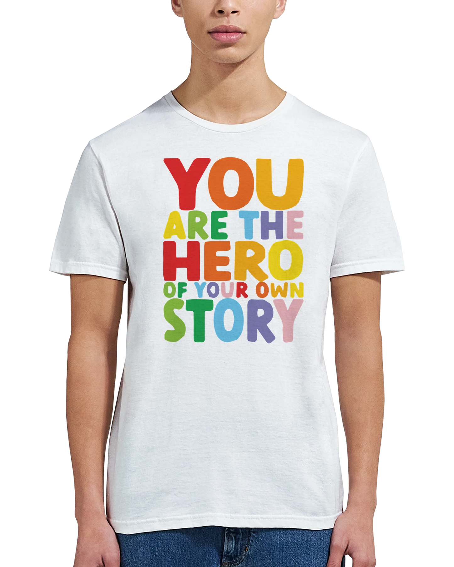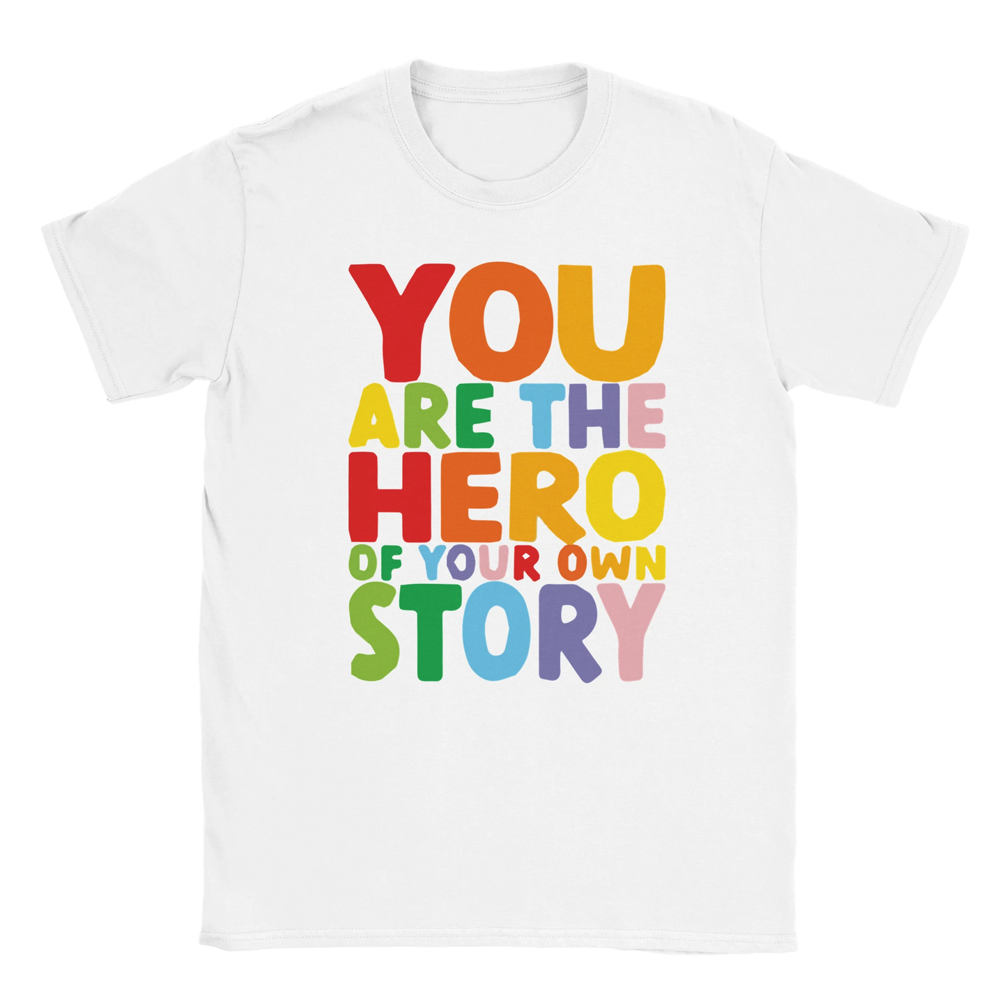 Spread positivity with this vibrant, rainbow-colored motivational design. Bold typography delivers an empowering message 'You Are The Hero Of Your Own Story' in cheerful, graduated colors. Perfect for those who love inspirational quotes and colorful, uplifting artwork