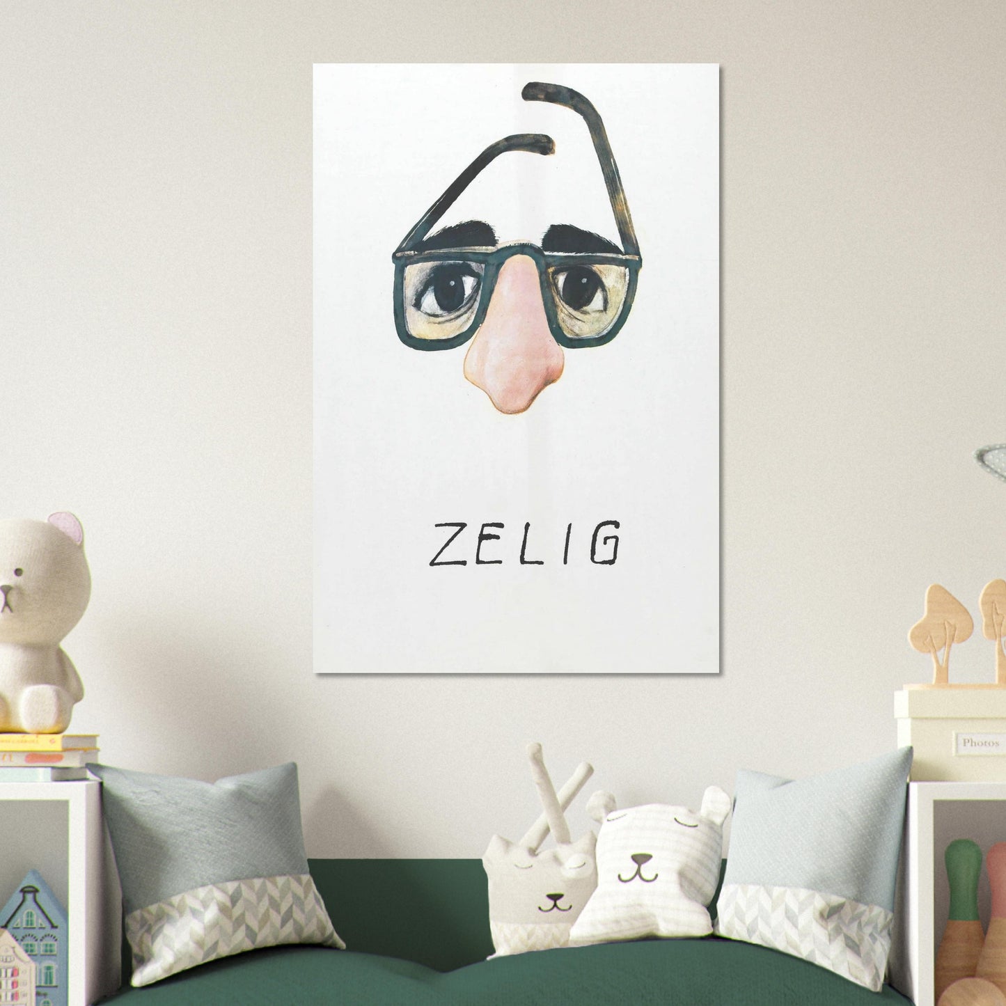 A minimalist watercolor illustration featuring iconic thick-rimmed glasses and a prominent nose, with 'ZELIG' text beneath. The simple yet striking design captures the essence of the classic film with a clean, artistic approach. The soft watercolor technique adds a gentle, whimsical quality to this distinctive piece